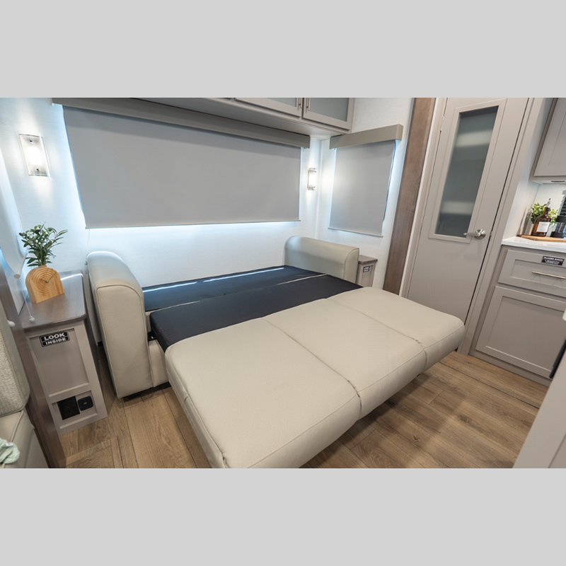 Sleeps 5 Slides 1 Length 34 ft 11 in Ext Width 8 ft 5 in Ext Height 13 ft 2 in GVWR 11895 lbs Fresh Water Capacity 45 gals Grey Water Capacity 53 gals Black Water Capacity 53 gals Number Of Bunks 2 Available Beds Queen Refrigerator Type 12V Refrigerator Size 10 cu ft Cooktop Burners 3 Shower Size 30" x 36" Number of Awnings 1 AC BTU 13500 btu TV Info LR 50" HDTV Axle Count 2 Washer/Dryer Available Yes Shower Type Standard Similar Floorplans