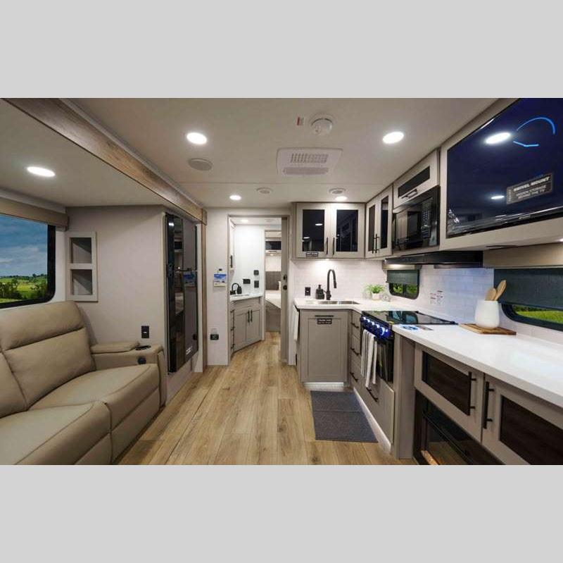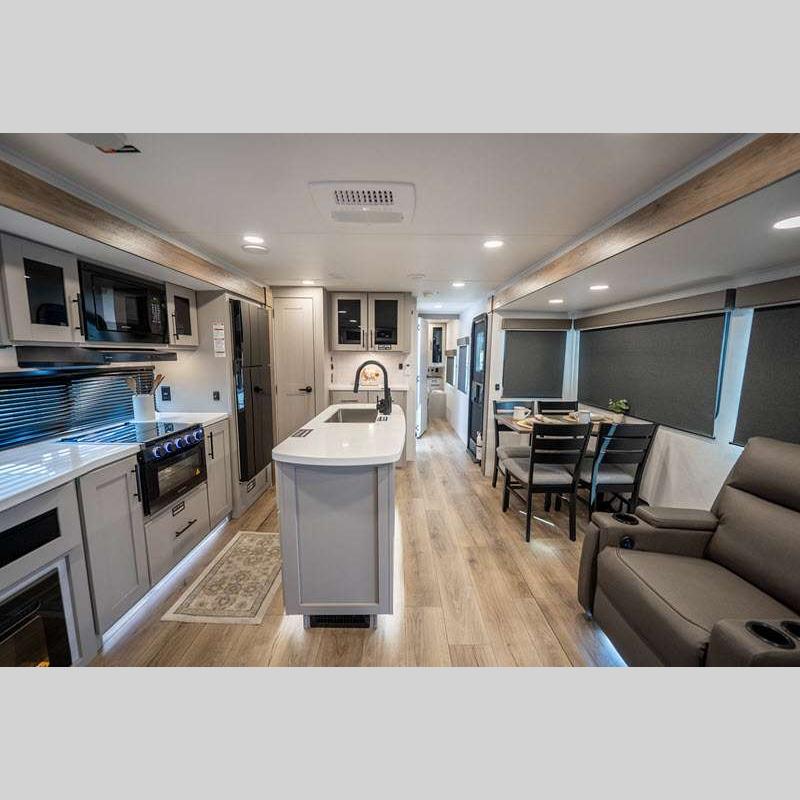 Sleeps 4 Slides 2 Length 33 ft 11 in Ext Width 0 ft Ext Height 11 ft 3 in Int Height 0 ft Hitch Weight 841 lbs GVWR 9250 lbs Dry Weight 7316 lbs Fresh Water Capacity 45 gals Grey Water Capacity 90 gals Black Water Capacity 45 gals Available Beds Queen Refrigerator Type 12V Refrigerator Size 10 cu ft Cooktop Burners 3 Shower Size 30" x 36" Number of Awnings 2 Cargo Deck Size 0 ft TV Info LR 50" TV Awning Info 12' and 14' Axle Count 2 Shower Type Standard Electrical Service 50 amp Solar Wattage 400 watts Similar Floorplans