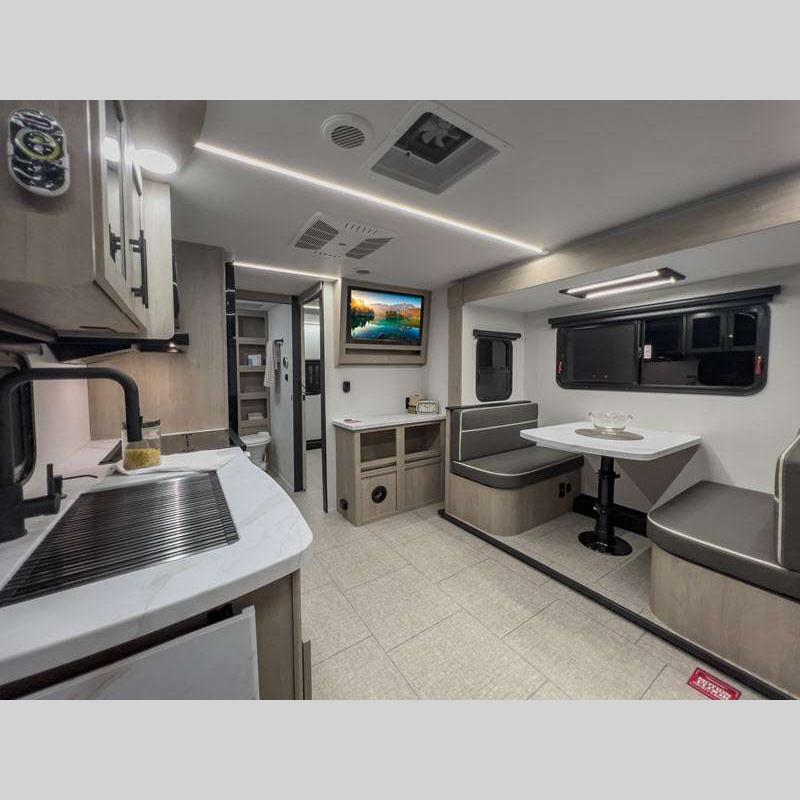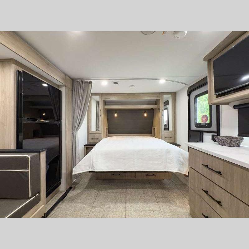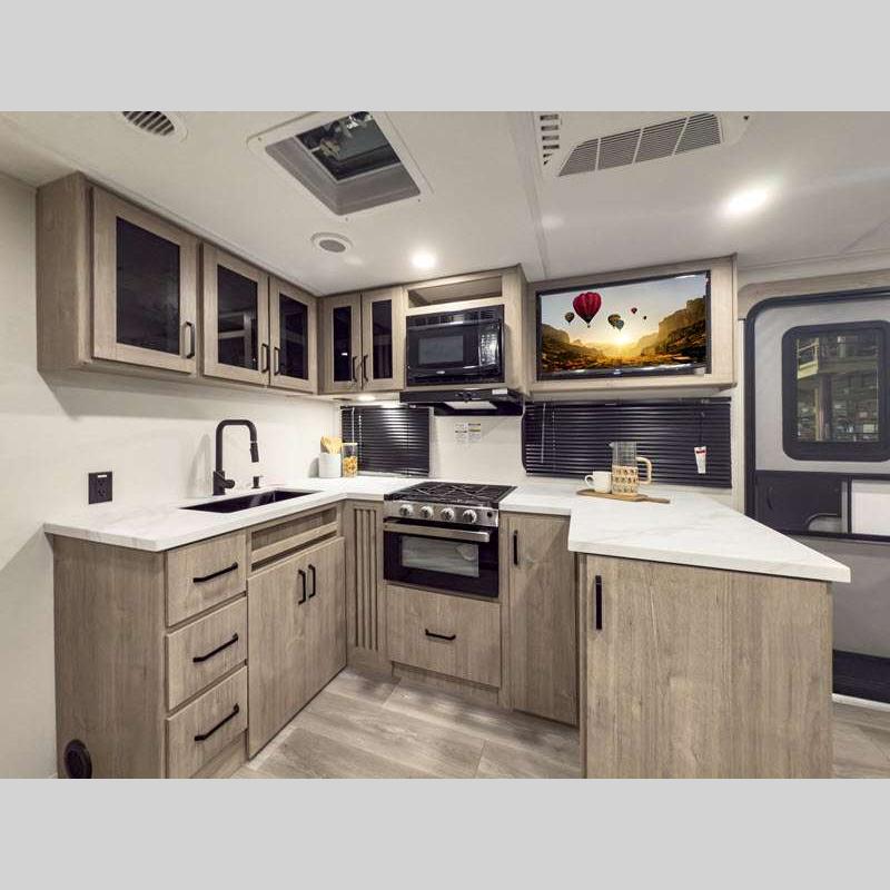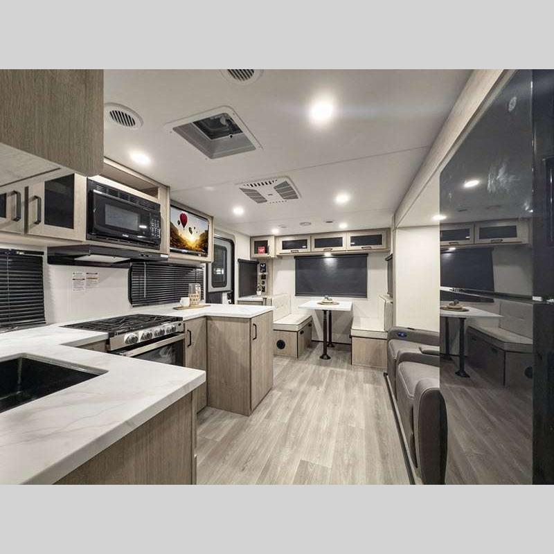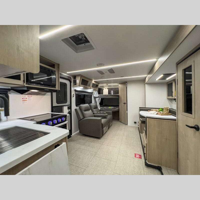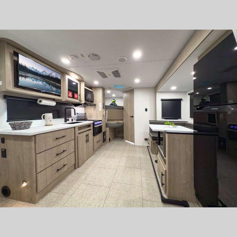 Sleeps 5 Slides 2 Length 25 ft 4 in Ext Width 8 ft Ext Height 10 ft 10 in Int Height 6 ft 6 in Hitch Weight 616 lbs GVWR 6995 lbs Dry Weight 5698 lbs Fresh Water Capacity 37 gals Grey Water Capacity 45 gals Black Water Capacity 37 gals Tire Size ST205/75R14LRD Furnace BTU 25000 btu Number Of Bunks 2 Available Beds Murphy Refrigerator Type 12V Refrigerator Size 10 cu ft Cooktop Burners 3 Shower Size 27" x 36" Number of Awnings 1 LP Tank Capacity 20 lbs Water Heater Type Tankless AC BTU 15000 btu TV Info LR LED HDTV Awning Info 18' Power w/LED Light Axle Count 2 Number of LP Tanks 2 Shower Type Walk-In Shower Electrical Service 30 amp Solar Wattage 200 watts Similar Floorplans