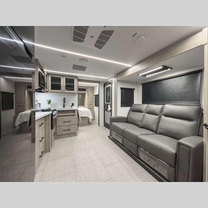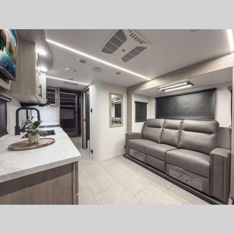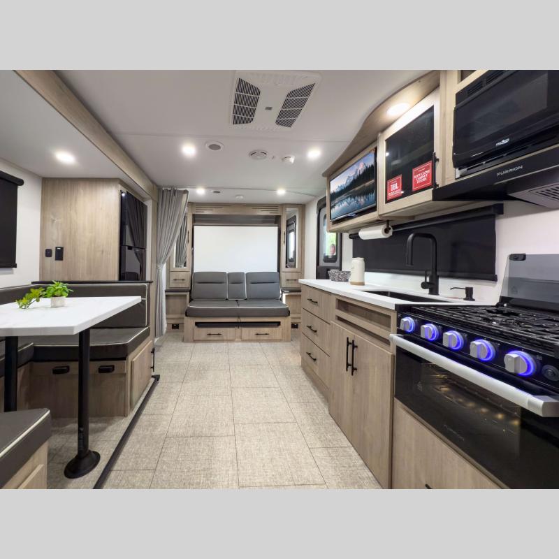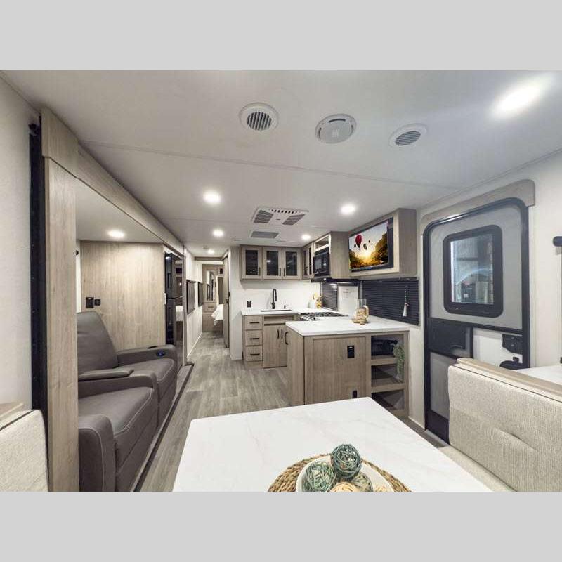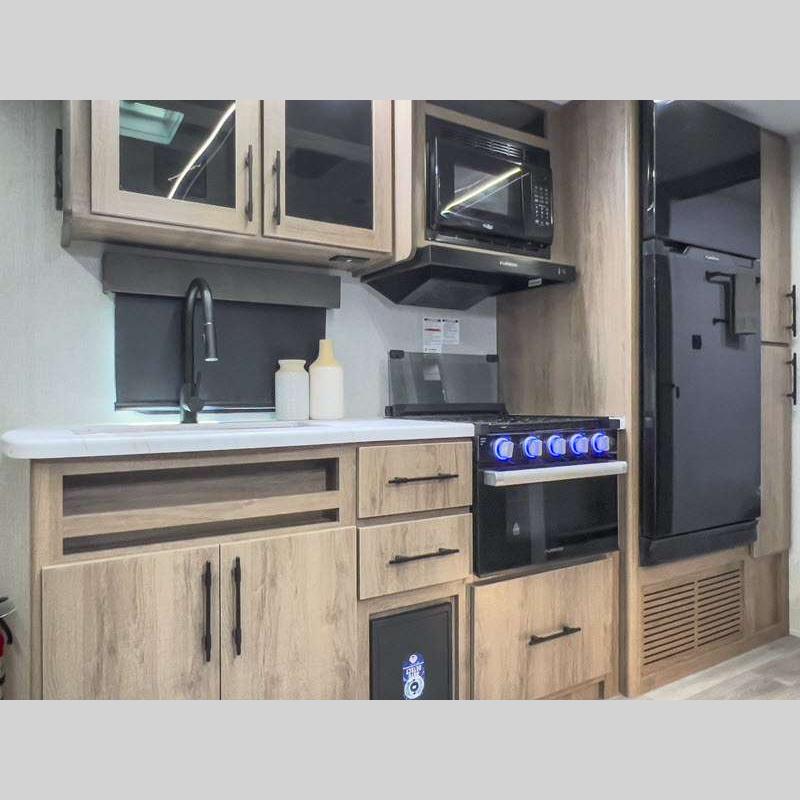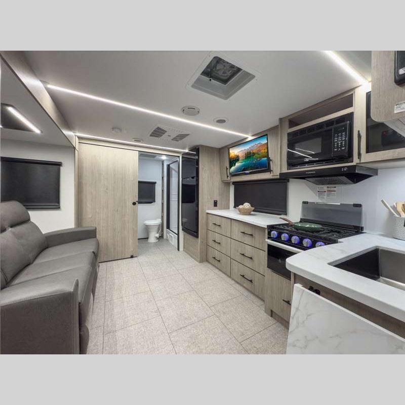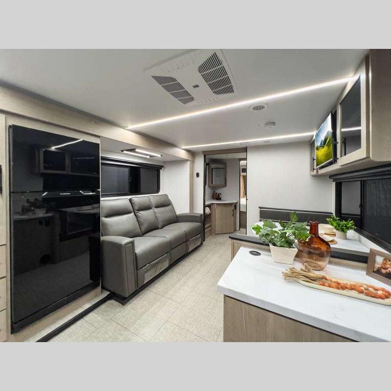 The gel-coated fiberglass exterior and one-piece roof membrane form the base that holds all of the many features, like the three-burner range with an oven, residential walk-in shower, high capacity furnace, and LED HDTV. The friction-hinge entry door won't fly away when you open it, and the residential countertops will let you set down dinner plates. There is a large panoramic window and LED lighting to keep your trailer feeling open, and the four packages included will provide even more features you won't want to camp without. Some of these features include a 200W solar panel, an accessory hitch, and a full width pass-thru storage!