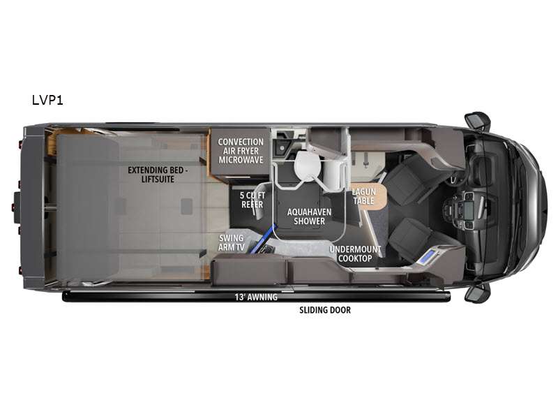 Step inside and discover a thoughtfully designed adventure-built motorhome for comfort and convenience. Outside, the 13-foot awning creates the perfect shaded retreat for relaxing with s’mores after a day of exploring. Enter through the front sliding door and unwind in the swiveling driver and passenger seats, ideal for kicking back and enjoying the view. The side-facing lounge bench with a Lagun table offers a cozy spot to dine, work remotely, or gather for board games. In the kitchen, you’ll find everything needed to prepare a great meal, including an Invisacook hidden single-burner induction cooktop, a Furrion 0.9 cu. ft. air fryer convection microwave, and a spacious Norcold 5.3 cu. ft. dual-compartment refrigerator. The bathroom features an AquaHaven shower with a versatile door for multiple configurations, along with a convenient sink with pullout wand and a medicine cabinet for storage. At the rear, the expanding Lift Suite drop-down bed provides a restful night’s sleep, complemented by LED reading lights and a swing-arm TV—perfect for winding down with a movie in total comfort.