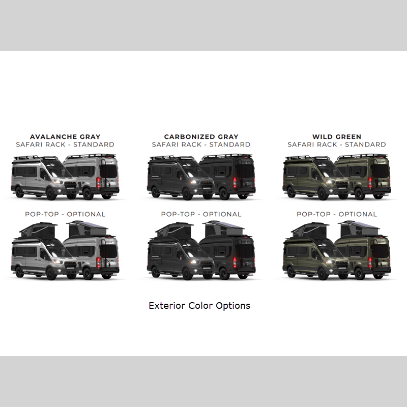 Sleeps 2 Length 20 ft 11 in Ext Width 6 ft 9 in Ext Height 10 ft 2 in Int Height 6 ft 4 in Exterior Color Carbonized Gray, Avalanche Gray, Wild Green GVWR 9950 lbs Fresh Water Capacity 34 gals Grey Water Capacity 23 gals Tire Size 255/70R16 120/117S Furnace BTU 6800 btu Fuel Type Gas Engine 3.5L V6 GTDi Chassis Ford W2XC T350 AWD Horsepower 310 hp Fuel Capacity 25 gals Wheelbase 148 in Number Of Bunks 1 Available Beds Full Torque 400 ft-lb Refrigerator Type 12V Drawer Style Refrigerator Size 3.2 cu ft Number of Awnings 1 Axle Weight Front 4630 lbs Axle Weight Rear 6100 lbs Water Heater Capacity 2.5 gal AC BTU 20000 btu TV Info Projector and Screen Awning Info 11'6" Girard w/Wind Sensor Gross Combined Weight 12600 lbs Shower Type Wet/Bath Shower Electrical Service 30 amp Solar Wattage 360 watts