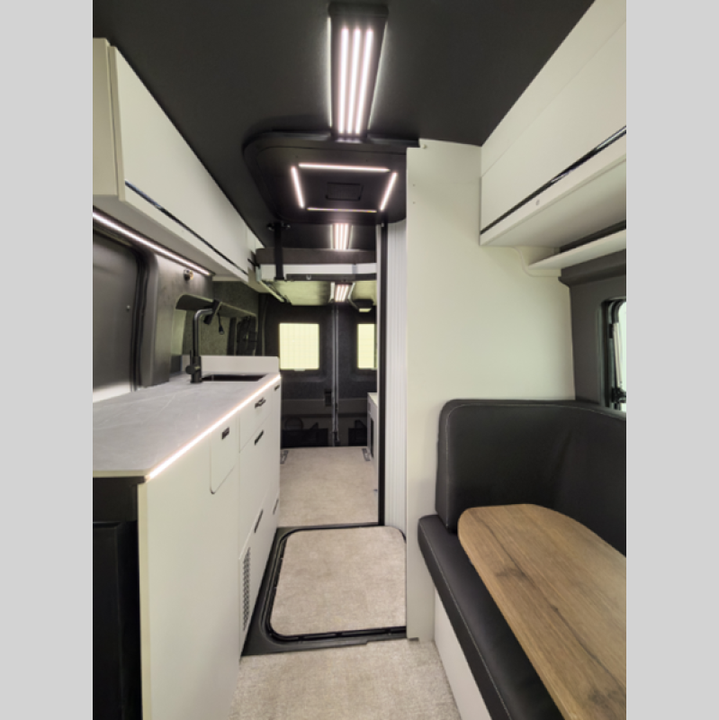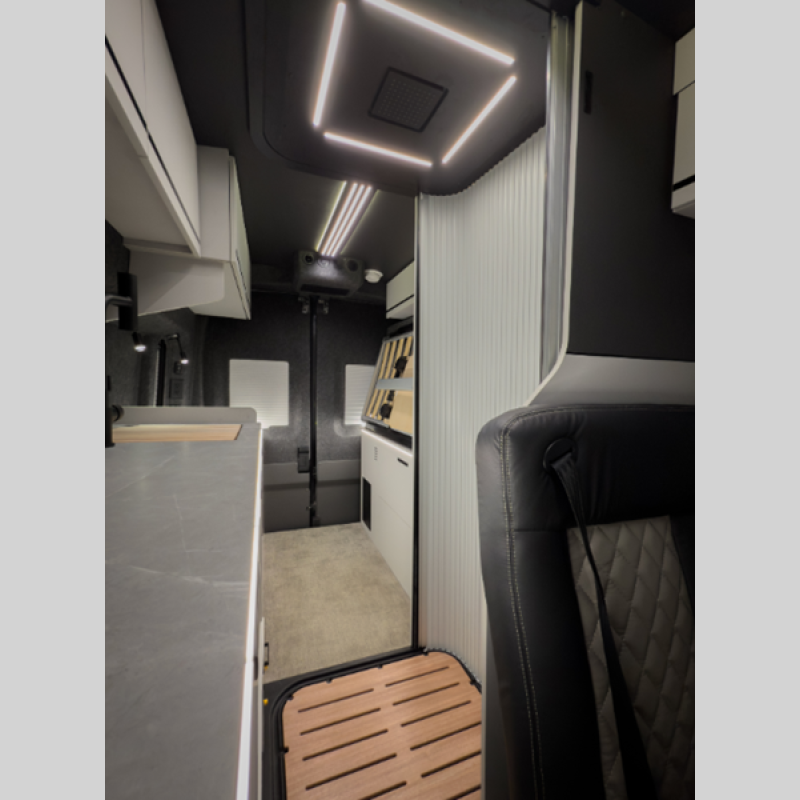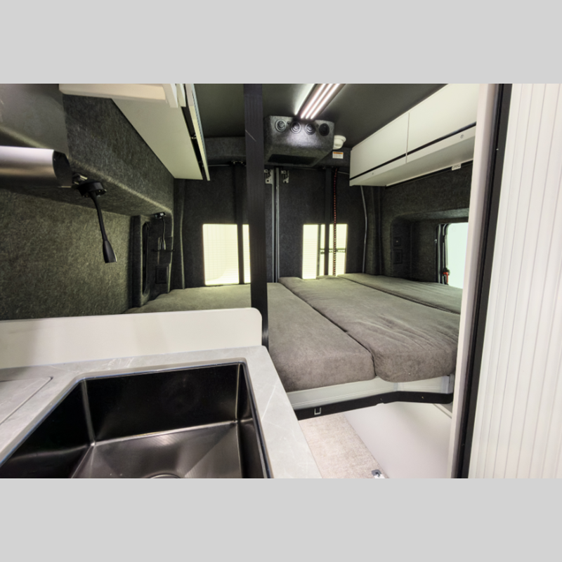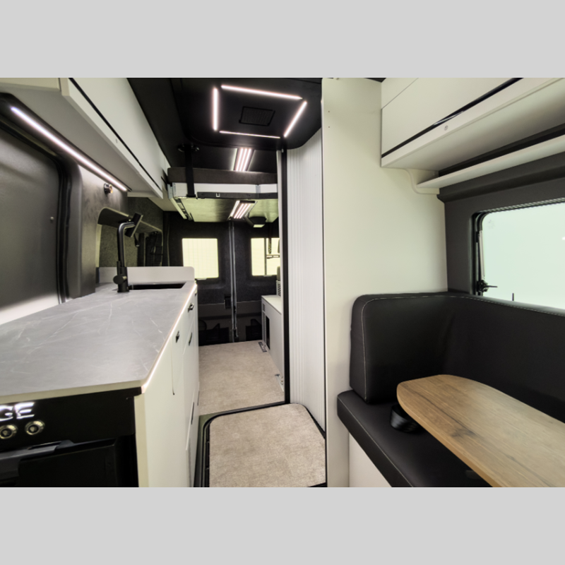 There is also a 10-speed transmission, a SYNC 4 system, adaptive cruise control, plus connected navigation and 360-degree camera the driver is sure to appreciate. You will stay powered up with a 51V Lithionics battery, 3,000W inverter, and two 180W solar panels. The interior is just as impressive with its double-pane acrylic skylight, integrated blackout shades and screen, and sleek porcelain countertop in the kitchen.