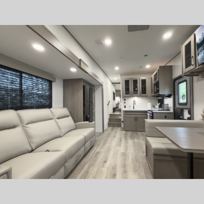 Sleeps 6 Slides 2 Length 35 ft 10 in Ext Width 11 ft 1 in Ext Height 12 ft 3 in Hitch Weight 1522 lbs GVWR 11995 lbs Dry Weight 9468 lbs Fresh Water Capacity 55 gals Grey Water Capacity 78 gals Black Water Capacity 39 gals Tire Size ST225/75R15 LRE Furnace BTU 30000 btu Available Beds Queen Refrigerator Type 12V Refrigerator Size 10 cu ft Cooktop Burners 3 Shower Size 30" x 36" Number of Awnings 1 LP Tank Capacity 30 lbs Water Heater Type On Demand Tankless AC BTU 15000 btu TV Info LR 40" High-Definition LED TV Awning Info 19' One Touch Electric LED Axle Count 2 Number of LP Tanks 2 Shower Type Walk-In Shower Electrical Service 50 amp Similar Floorplans