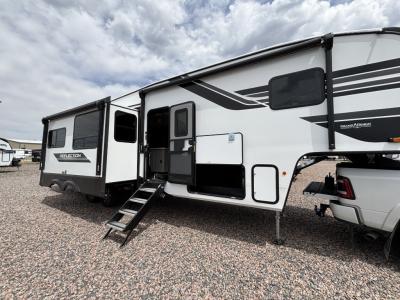 With any Reflection fifth wheel by Grand Design, you will have a solar panel for off-grid camping and a 60 amp charge controller and inverter prep, a Universal All-In-One docking station, unobstructed pass-through storage, and Goodyear Endurance tires. Each is constructed of gel coat exterior sidewalls, residential 5" truss rafters, walk-on roof decking, a fiberglass and radiant foil roof and front cap insulation plus laminated aluminum framed side walls, roof and end walls in slide rooms. Head inside to enjoy residential hardwood cabinet doors, premium Congoleum flooring, a spacious shower with a glass door, and many more comforts!
