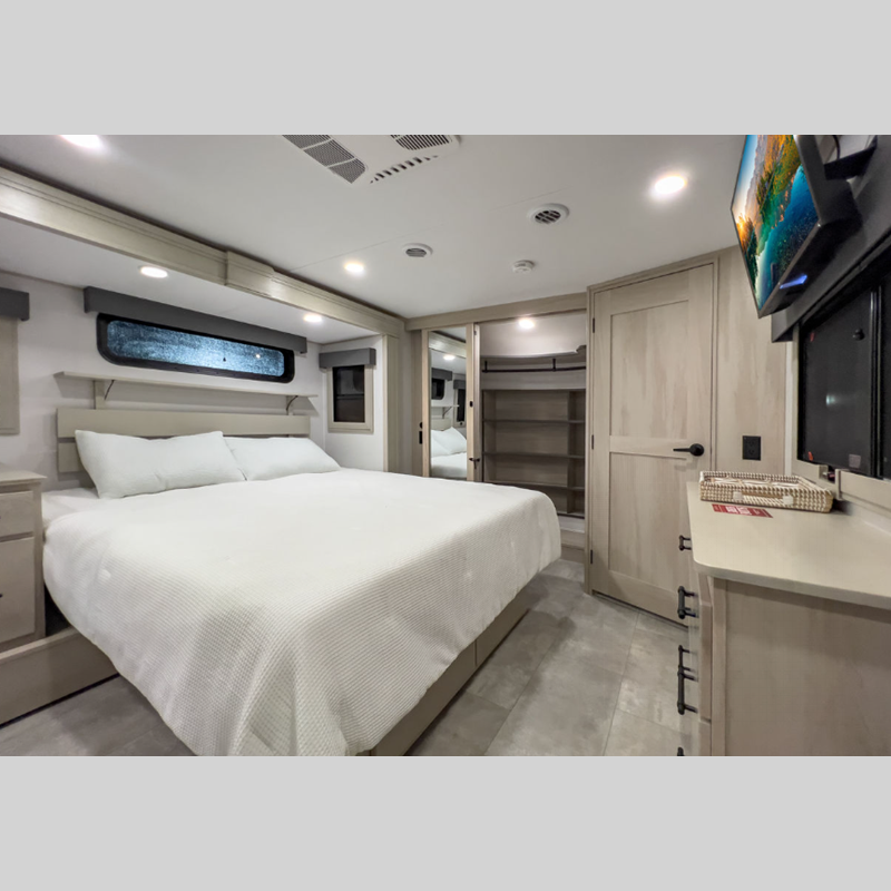 Sleeps 4 Slides 3 Length 34 ft 4 in Ext Width 8 ft 5 in Ext Height 13 ft 5 in Int Height 8 ft 1 in Exterior Color Standard Graphics or Aurora, Midnight, Pearl Full-Body Paint Options Hitch Weight 2350 lbs GVWR 19000 lbs Dry Weight 12100 lbs Fresh Water Capacity 81 gals Grey Water Capacity 106 gals Black Water Capacity 53 gals Tire Size ST215/75R 17.5 LRH Furnace BTU 35000 btu Available Beds Queen Refrigerator Type 12V Refrigerator Size 20 cu ft Cooktop Burners 3 Shower Size 48" x 30" Number of Awnings 2 Axle Weight 8000 lbs LP Tank Capacity 30 lbs. Water Heater Type Tankless On Demand AC BTU 30000 btu TV Info LR LED Smart TV Awning Info 10' 4" and 16' Power w/Integrated LED Lighting Axle Count 2 Washer/Dryer Available Yes Number of LP Tanks 2 Shower Type Shower w/Seat Electrical Service 50 amp Similar Floorplans