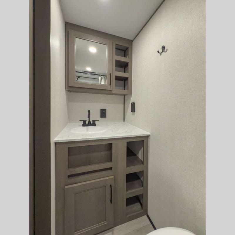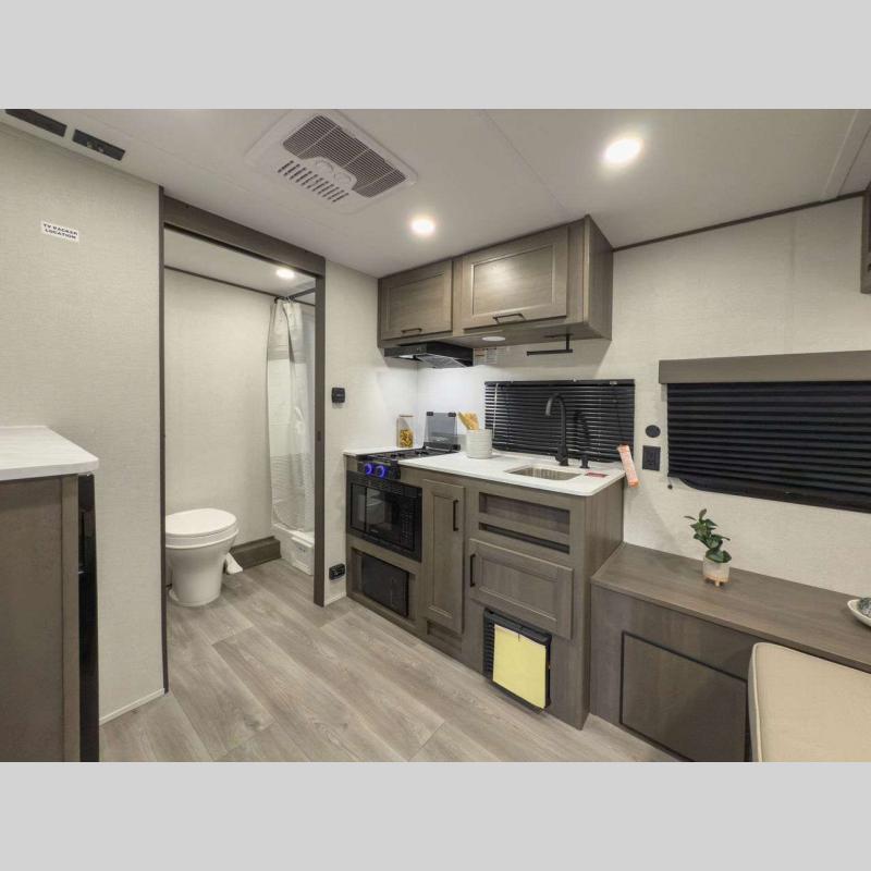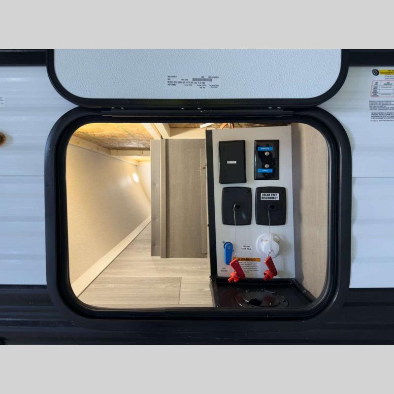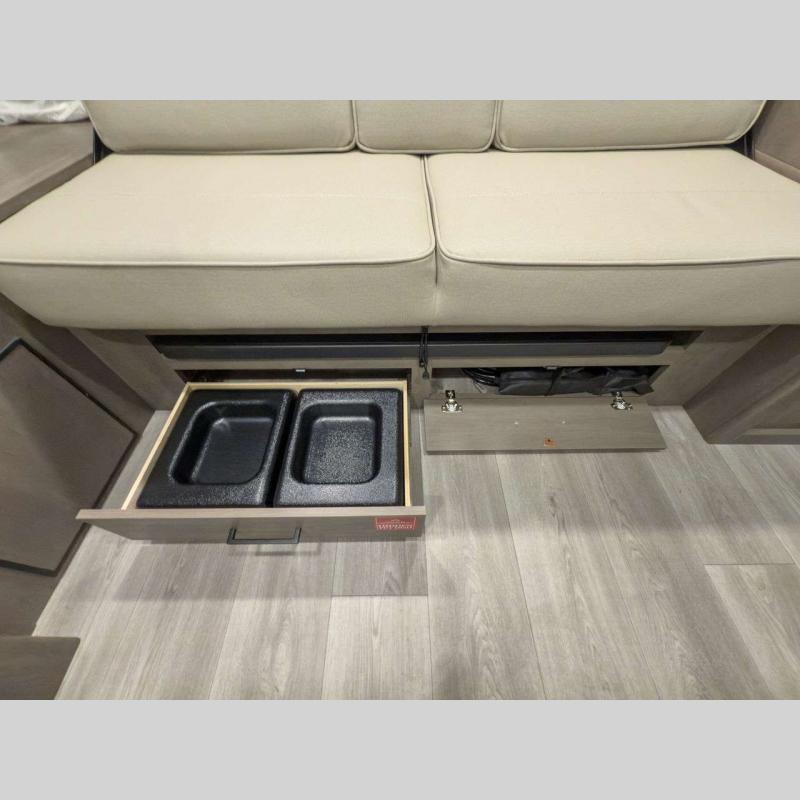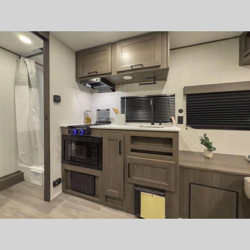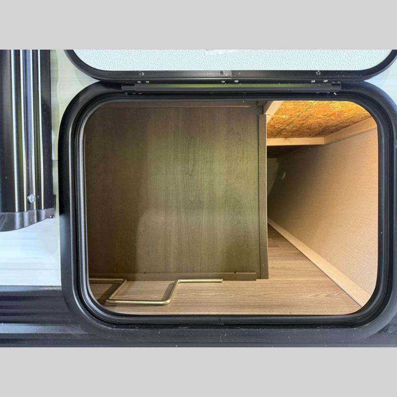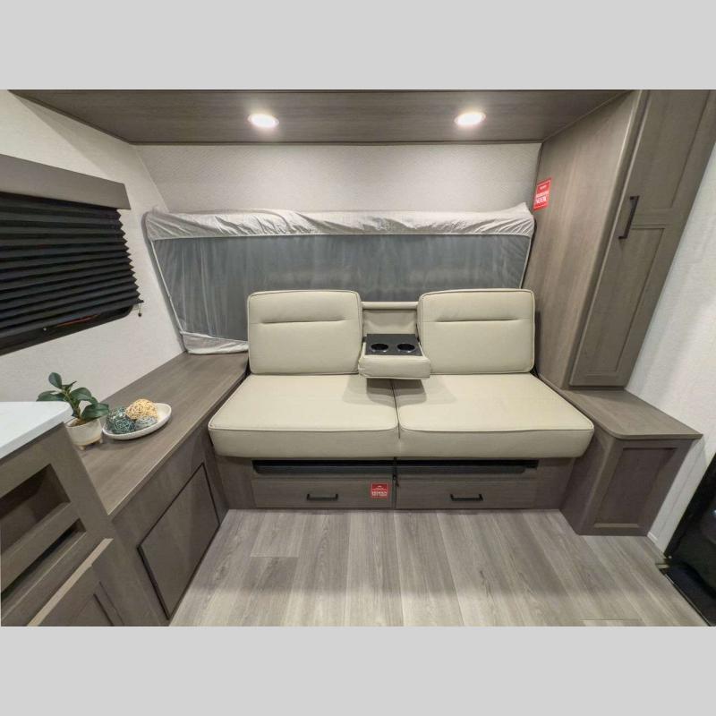 Each model is constructed to a superior standard with an insulated floor and enclosed underbelly plus residential insulated walls that will help with temperature regulation and moisture control. The 6' 6" interior height, tinted windows, and residential cabinet doors will make your space feel a little more like home, and the black automotive glass entry door is ultra sleek. You will find a power awning with a Fusion light outside, along with magnetic storage door catches, a Leash Link/bottle opener, and more convenient features!