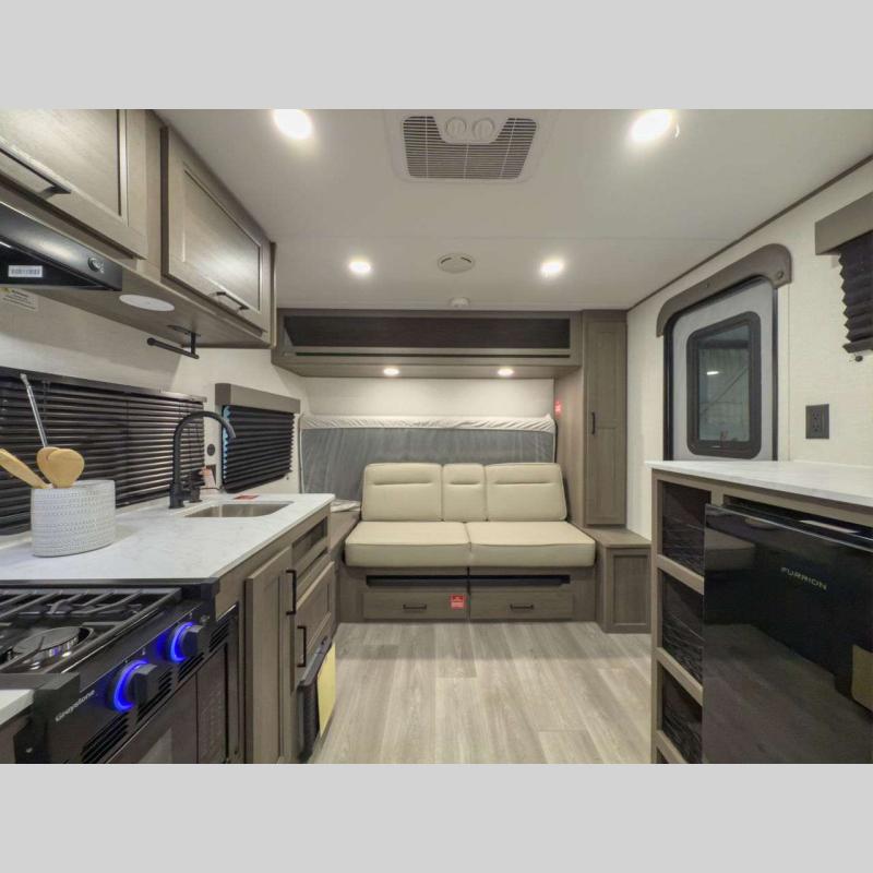 Sleeps 7 Slides 1 Length 23 ft Ext Width 8 ft Ext Height 10 ft 6 in Int Height 6 ft 6 in Hitch Weight 524 lbs GVWR 5500 lbs Dry Weight 4784 lbs Fresh Water Capacity 37 gals Grey Water Capacity 74 gals Black Water Capacity 37 gals Tire Size ST225/75R15LRE Furnace BTU 20000 btu Number Of Bunks 2 Available Beds Queen Murphy Bed Refrigerator Type Glass Front 12V Refrigerator Size 10 cu ft Cooktop Burners 2 Shower Size 27" x 36" Number of Awnings 1 LP Tank Capacity 20 lbs Water Heater Capacity 6 gal Water Heater Type Gas/Electric AC BTU 13500 btu Awning Info 16' Power w/Fusion Light Axle Count 1 Number of LP Tanks 1 Shower Type Walk-In Shower Similar Floorplans