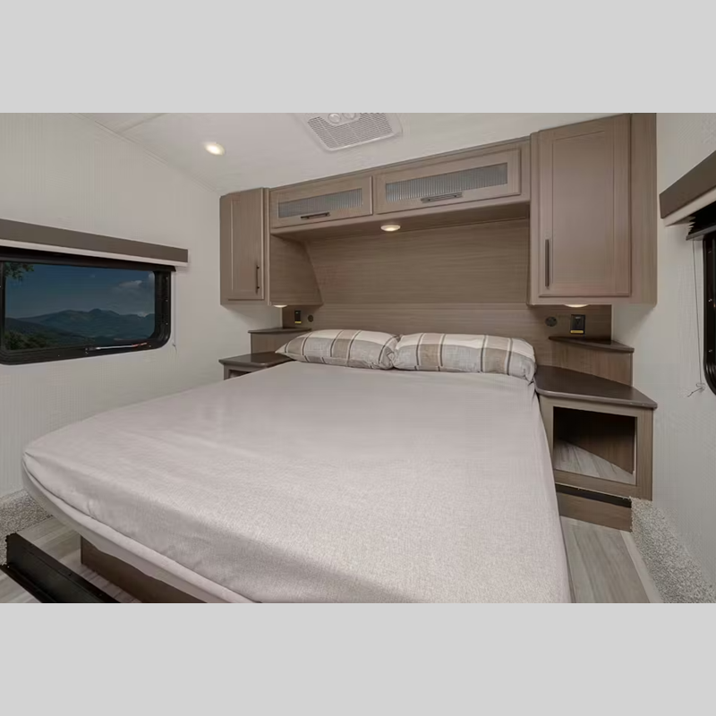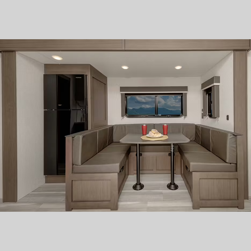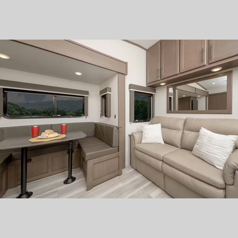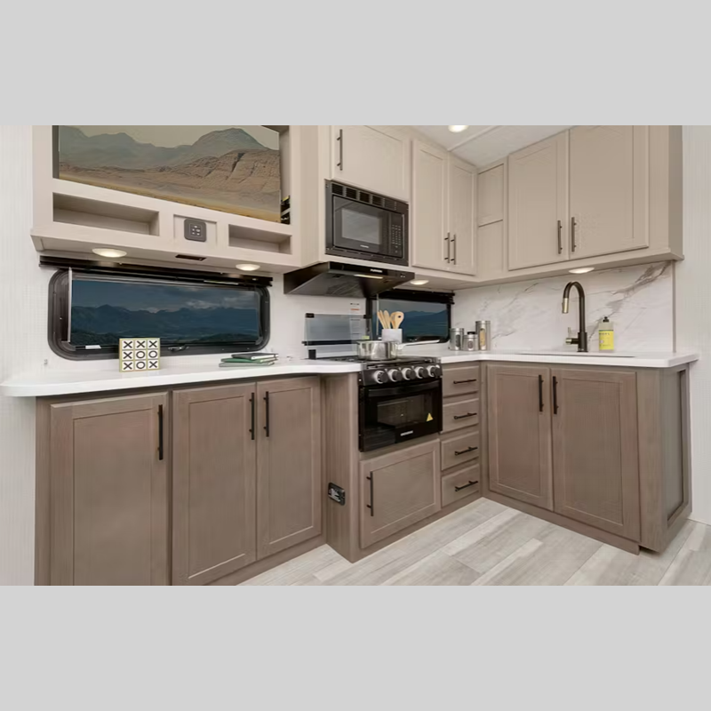 There is a Road Armor shock absorbing hitch pin for smooth towing and an engineered structural I-beam chassis with stamped steel cross-members and outriggers for added strength. You'll feel right at home with pleated privacy shades, residential, shaker style hardwood cabinet doors, and seamless pressed countertops.