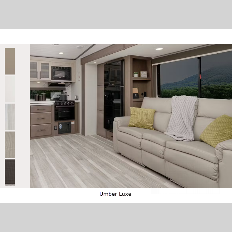 Sleeps 3 Slides 1 Length 28 ft 11 in Ext Height 12 ft 7 in Interior Color Umber Luxe Hitch Weight 1345 lbs Dry Weight 7474 lbs Cargo Capacity 2026 lbs Fresh Water Capacity 54 gals Grey Water Capacity 60 gals Black Water Capacity 30 gals Tire Size ST225/75R15E Available Beds Queen Refrigerator Type 12 Volt Refrigerator Size 10.4 cu ft Cooktop Burners 3 Number of Awnings 1 LP Tank Capacity 30 lbs. Water Heater Type Girard Tankless On Demand AC BTU 15000 btu TV Info LR 40" LED TV Awning Info 16' Electric w/Gas Strut Arm and Dotless Neon Style LED Lighting Axle Count 2 Number of LP Tanks 2 Shower Type Standard Electrical Service 50 amp Similar Floorplans