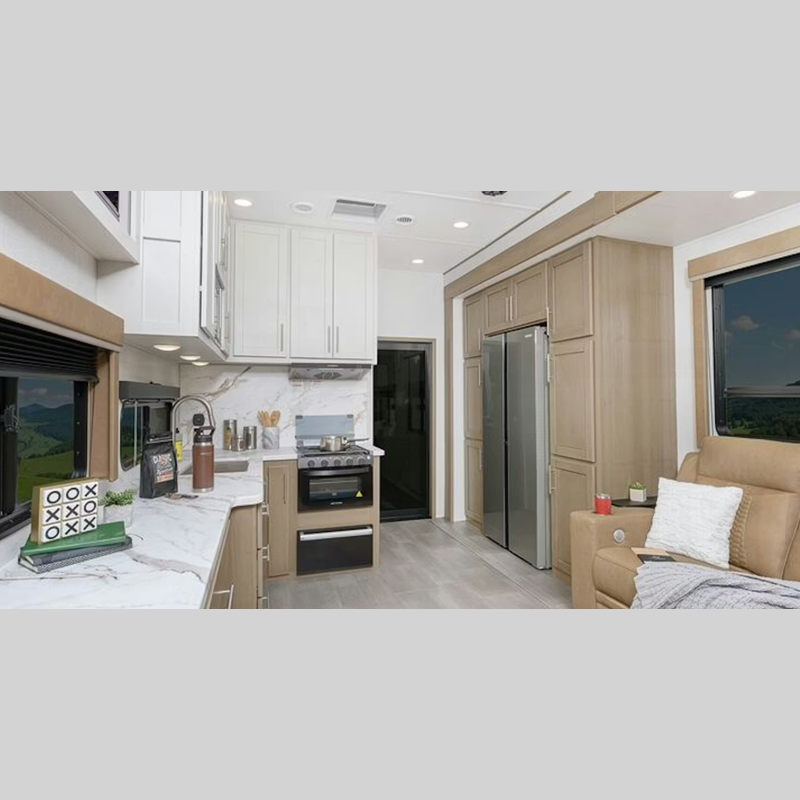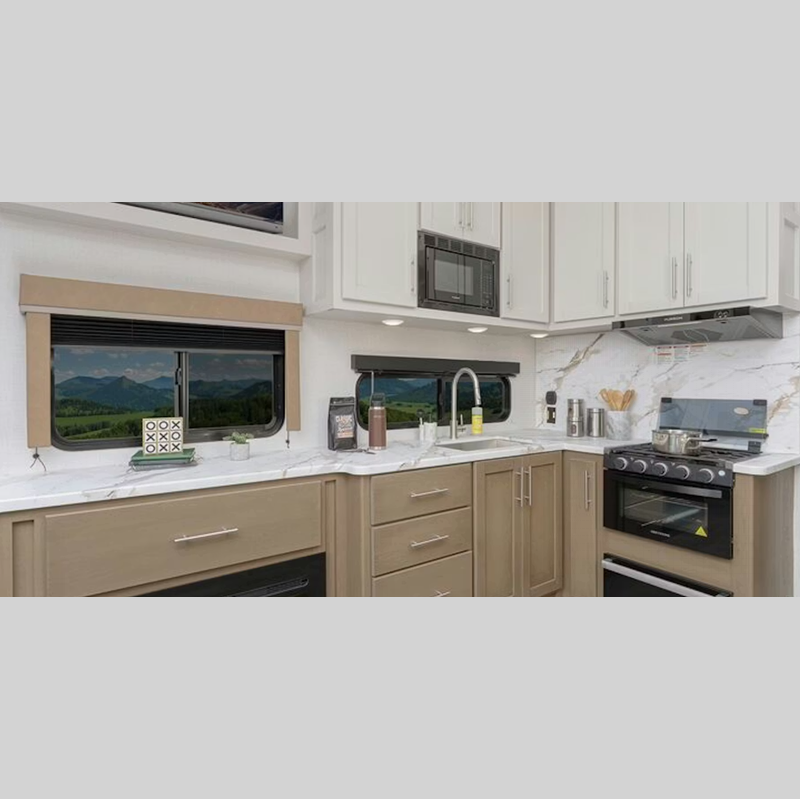 Each model features large tinted safety glass windows, furrion wireless backup camera prep, and a wide-body construction to fit your favorite toys on board. Inside, you will love 5K lbs. frame welded tie-downs, new larger shower, and 12V refrigerator. Also, check out the beautiful interior designs and additional sleeping space for guests!