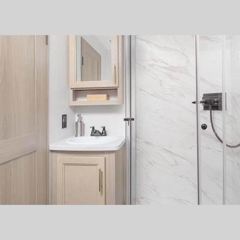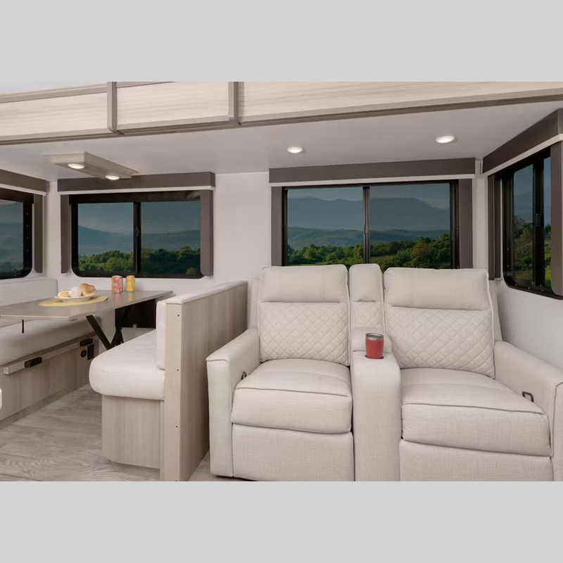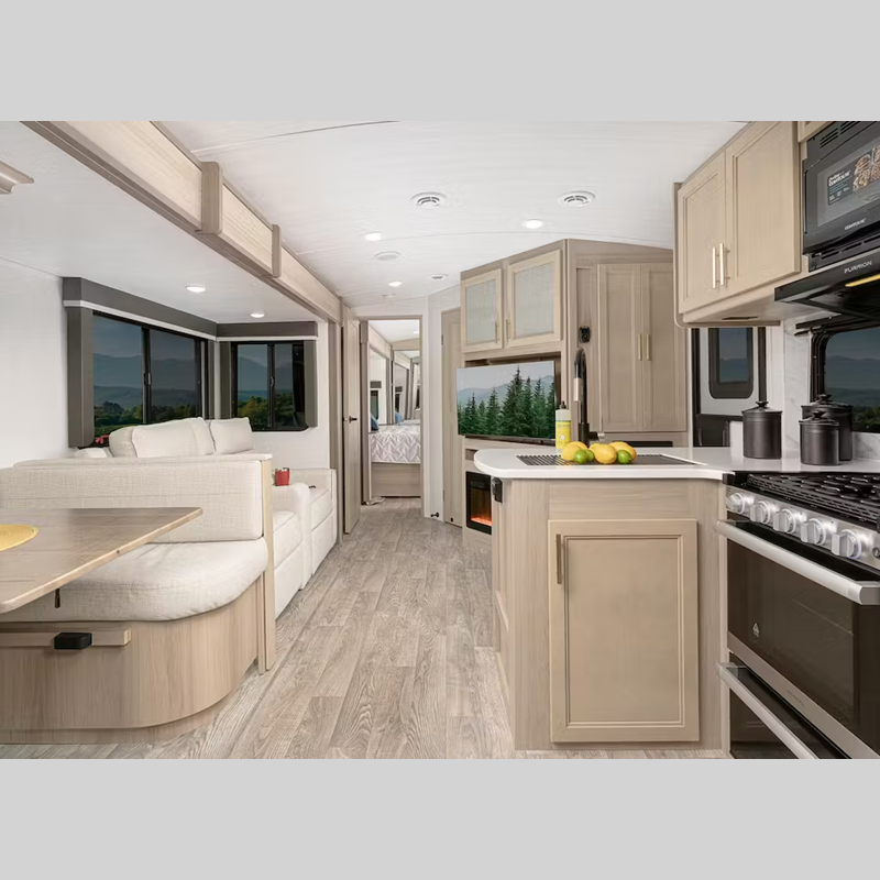 Each is built with a painted fiberglass front cap with LED strip lights and rock guard, fully walkable roof decking and a one-piece TPO membrane, and a HyperDeck high-performance water-resistant floor that is strong and light. The interior provides solid surface kitchen countertops, 78" arched interior ceilings, hardwood cabinetry, plus much more.