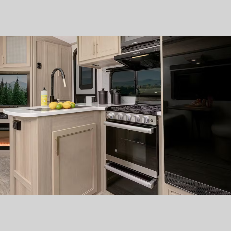 • 3-burner gas range and 21" Furrion® stove w/ low pro hood vent