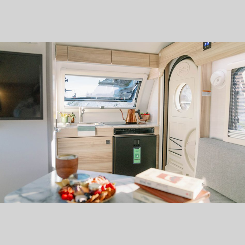 Sleeps 2 Length 15 ft 6 in Ext Width 6 ft 9 in Ext Height 8 ft Int Height 5 ft 9 in Exterior Color White, Silver, Charcoal Hitch Weight 202 lbs Dry Weight 2069 lbs Fresh Water Capacity 19 gals Grey Water Capacity 17 gals Black Water Capacity 5 gals Tire Size 235/75R15 Refrigerator Type 12V Compressor Refrigerator Size 2.3 cu ft Cooktop Burners 2 Axle Weight 3000 lbs Water Heater Type Alde Axle Count 1 Shower Type Wet/Bath Shower Similar Floorplans